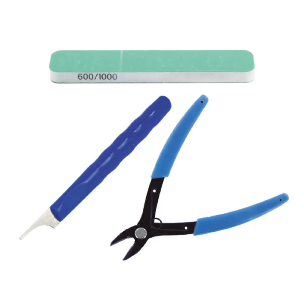 A set for plastic modeling, military modeling and other hobby applications. Includes flexi sander for working on flat and curved surfaces, mould line remover with steel edge and ergonomic handle, and sprue and plastic cutter ideal for flush cuts in plastics and sprues.