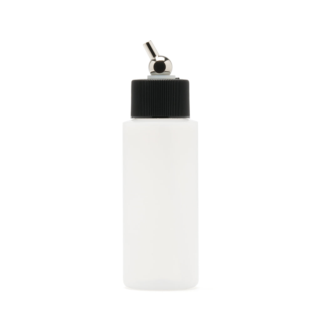 Iwata High Strength Translucent Bottle 2 oz / 60 ml Cylinder With adaptor cap is solvent-proof for all airbrush paint mediums. The no-rust metal friction fit connector easily affixes onto your airbrush. Comes with an Iwata Redi-Cap to store or transport paint.