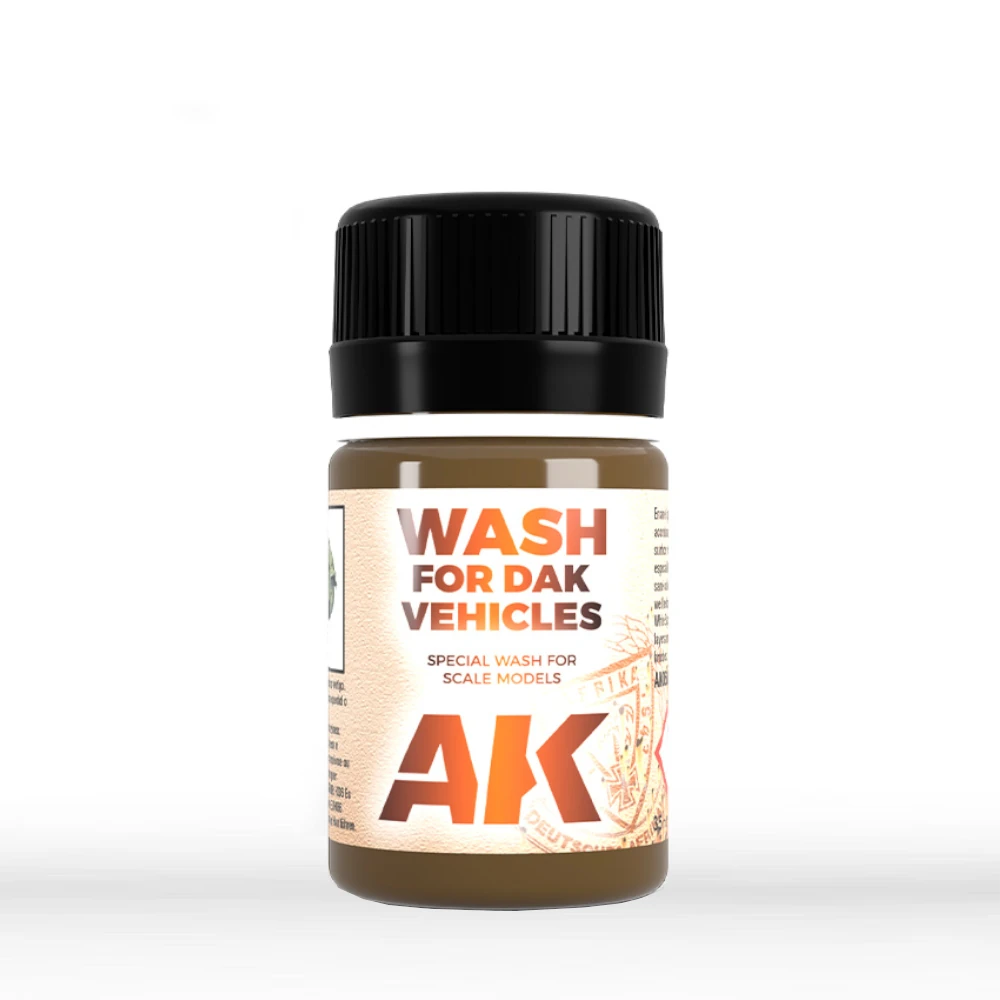 D.A.K. wash for Africa Corps vehicles, also other light colored desert vehicles. Apply on details and remove excess with a clean brush moist with Enamel Thinner. A very appropriate color for desert vehicles painted with a light sand color, especially German tanks from DAK. The basic technique used to weather any type of model is the wash, a classic technique that is still one of the most used techniques in modelling today. Apply the washes after shaking the bottle with a large brush to pick out details and creating shadows.