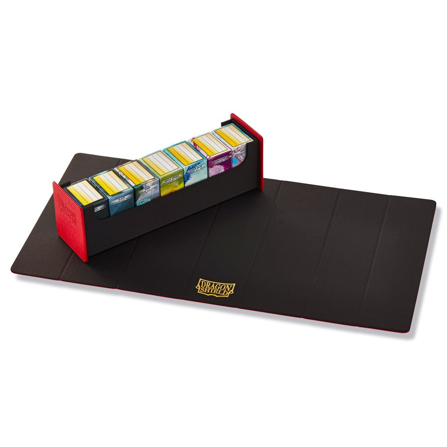 The Dragon Shield "Magic Carpet" storage box offers an easy and stylish way to store and transport your cards. It combines elegant design and a strong magnetic seal for premium protection. The exterior can be separated from the storage tray and used as a Playmat, so you always have one handy, when you are transporting your cards.