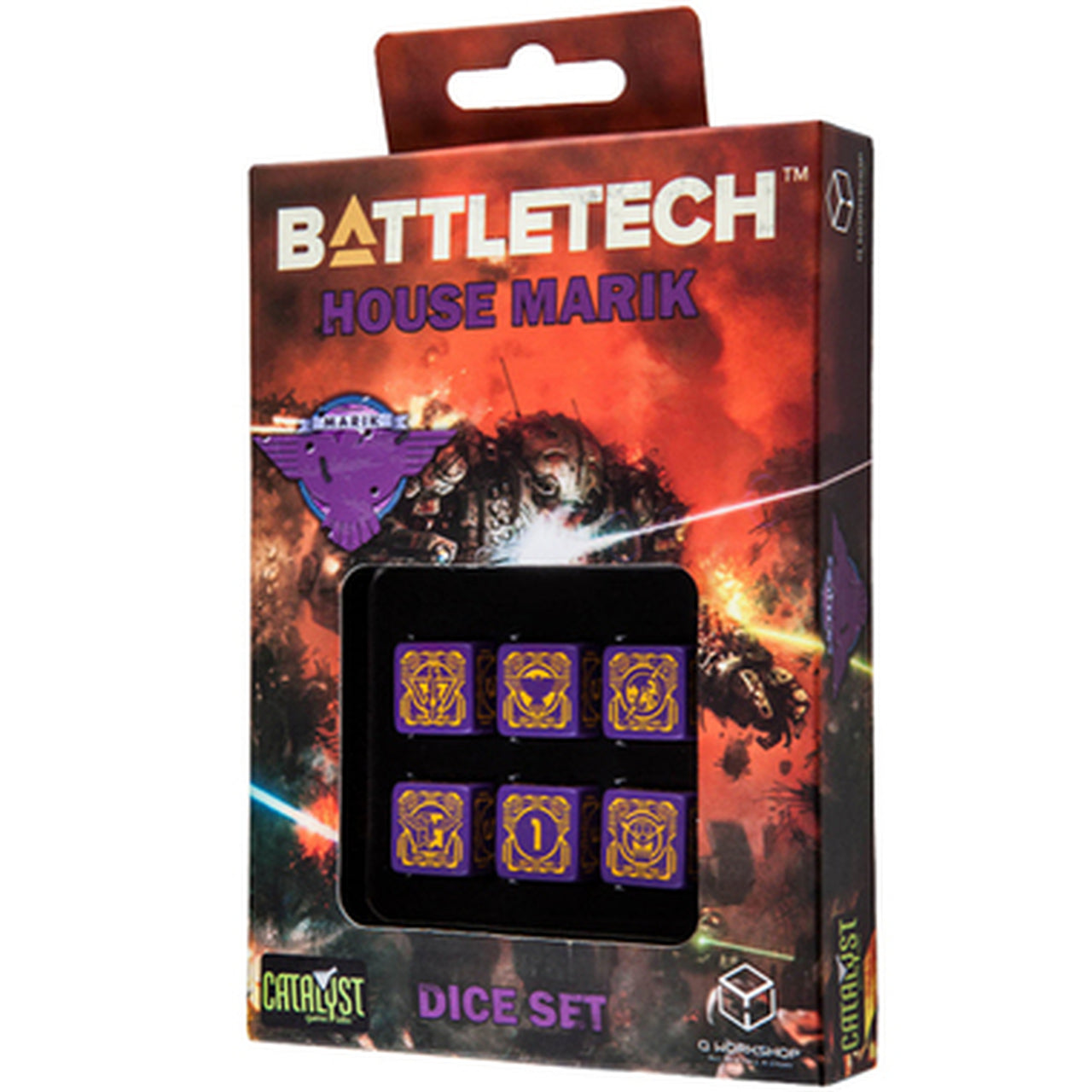 Set of six plastic dice in purple and yellow for BattleTech game from Catalyst Game Labs. The set is dedicated for House Marik and contains the following dice: 2 x House Marik, 21sr Centauri Lancers (Merc), Defenders of Andurien, Marik Militia and Sirian Lancer.