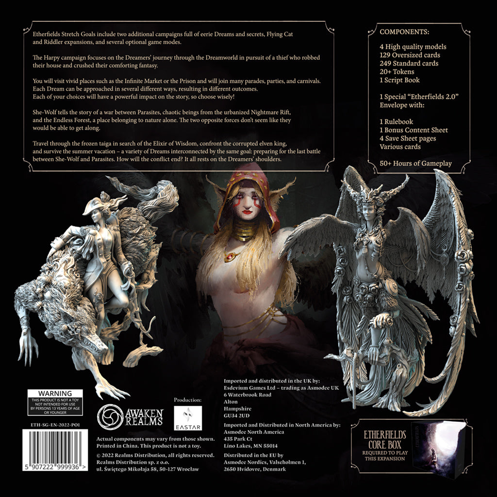 Etherfields Stretch Goals offer 2 new campaigns with eerie Dreams and secrets, plus Flying Cat and Riddler expansions, and optional game modes.