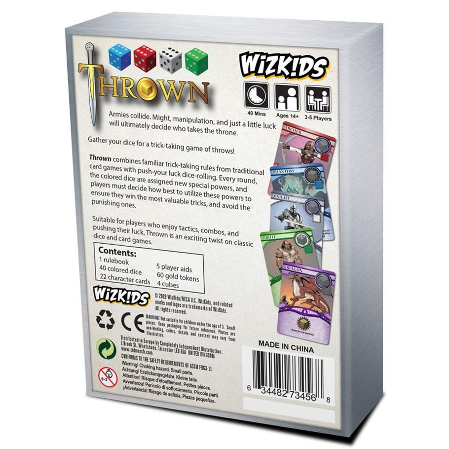 In Thrown, the way to play into a trick is by using dice! The colors of the dice represent the suits. The lead player rolls 1-3 dice of a color (the suit) and the other players try to roll in-suit to get the highest value on the table. If you do not have the right suit, then you can roll for trump: rolling a natural 6 on one of your dice in an off-suit will beat the highest value in-suit.