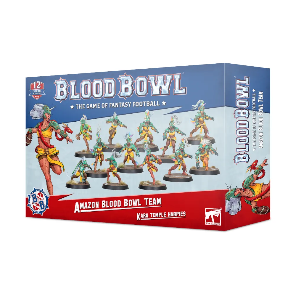 The multipart plastic kit allows you to assemble the Kara Temple Harpies, an Amazon team for use in games of Blood Bowl for a total of 12 players.