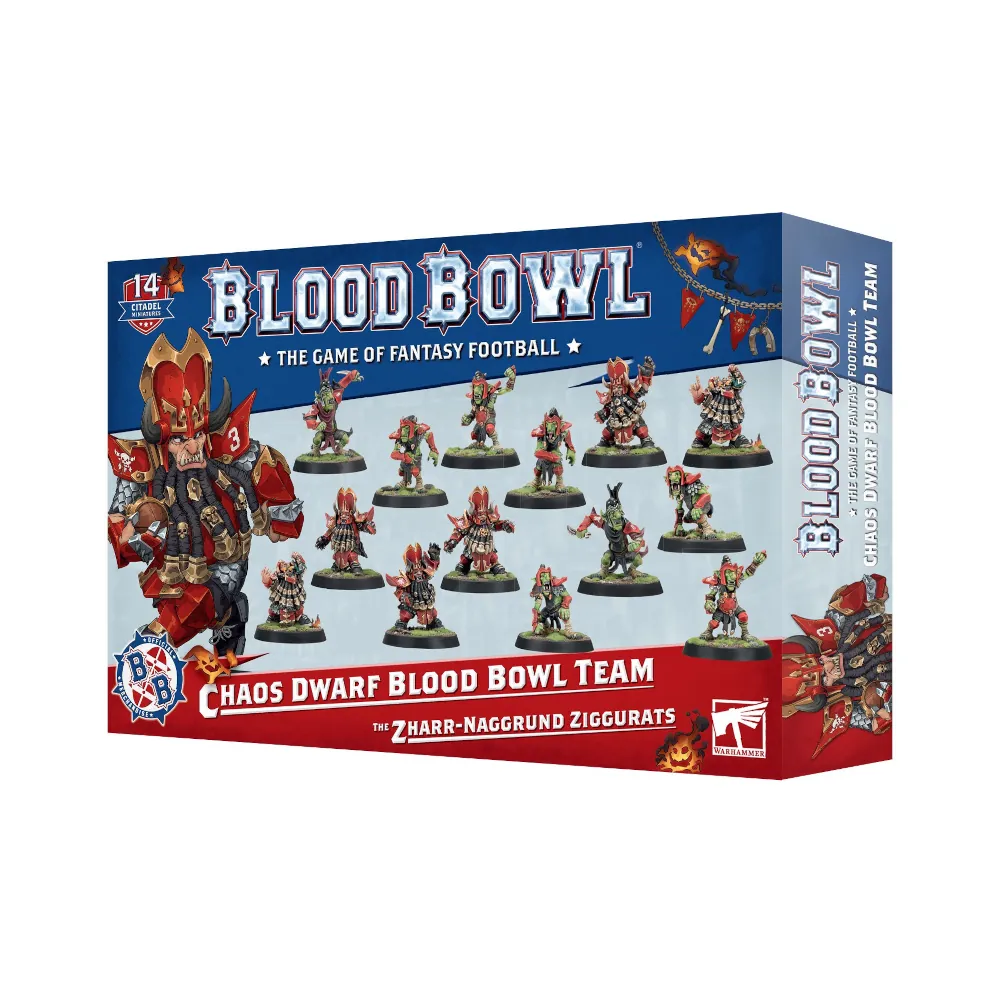 The 122x part plastic kit allows you to assemble the Zharr-Naggrund Ziggurats, a Chaos Dwarf team for use in games of Blood Bowl for a total of 14x players.
