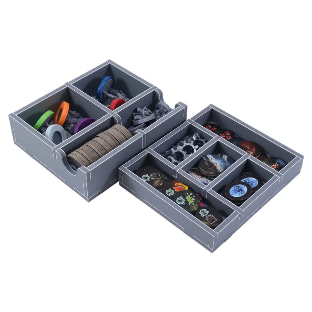 Insert compatible with Nemesis®. The design provides both efficient storage and improved game play. The trays can be utilized during the game, and they greatly aid set-up and clear-away times. The rules and boards act as a lid on top of the trays.