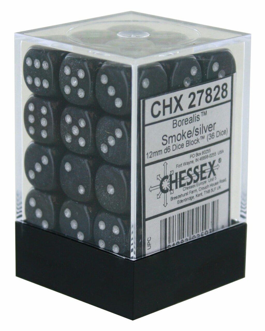 Chessex Borealis™ Smoke with Silver Pips 12mm Dice Block (36 dice)