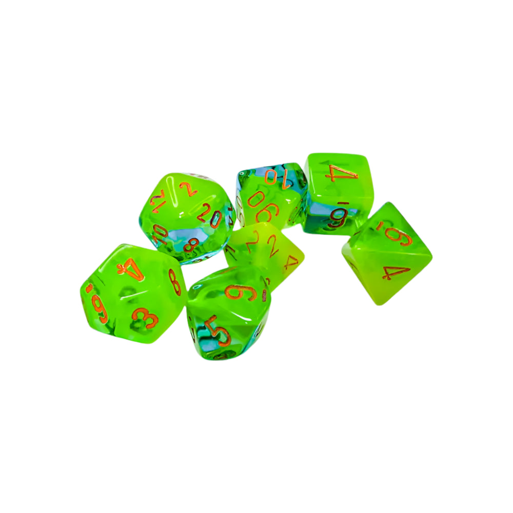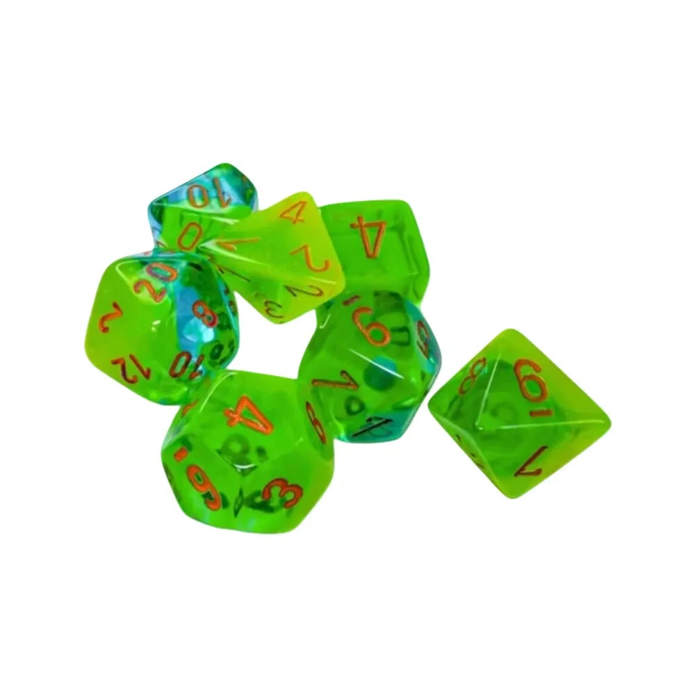 Chessex Gemini™ Plasma Green/Teal Polyhedral Dice with Orange Numbers Luminary - Set of 7