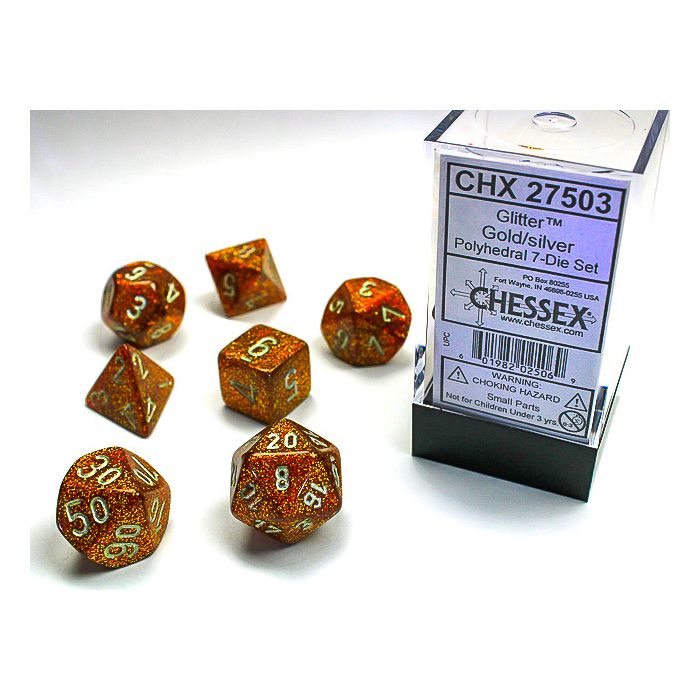 Chessex Glitter Gold Polyhedral Dice with Silver Numbers - Set of 7