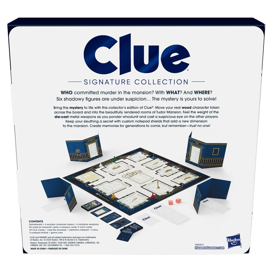 The Clue Signature Collection board game is a giftable, gorgeous edition of the popular family board game. With its elegant design and high-quality components, this display-worthy version of the Clue game is designed to be a family favorite for generations to come. In this premium edition, keep suspicions a secret and see new angles of the mansion with notepad shields.