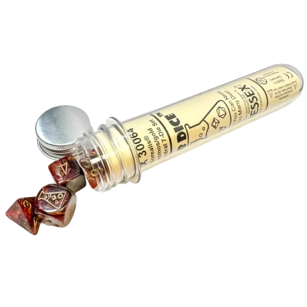 The dice are Cosmos (red, gold, brown, black) with gold numbers. They are packaged in a clear hard plastic container in the shape of a lab test tube.