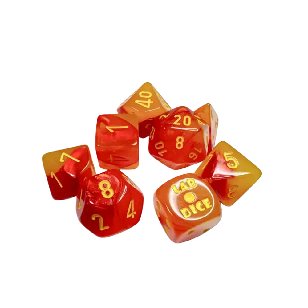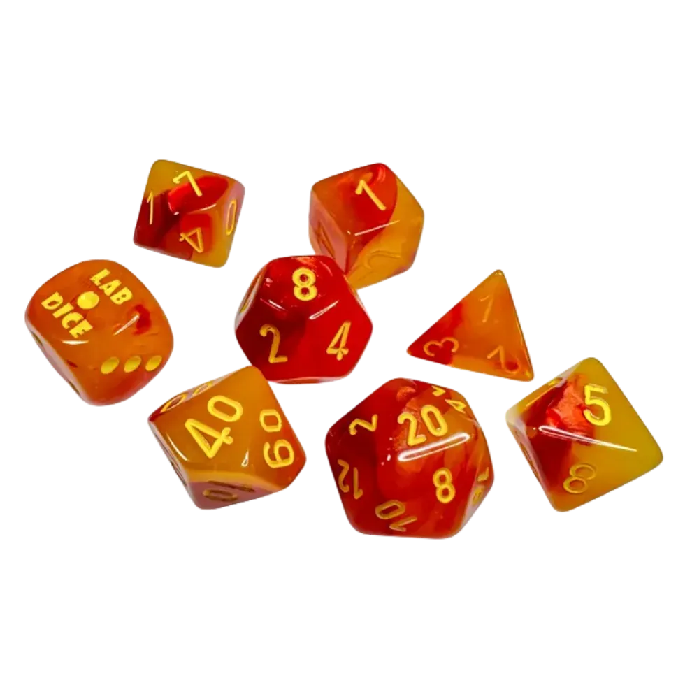 Chessex Lab Dice Gemini™ Gellow-Red/Yellow Polyhedral Luminary with Yellow Numbers - Set of 7