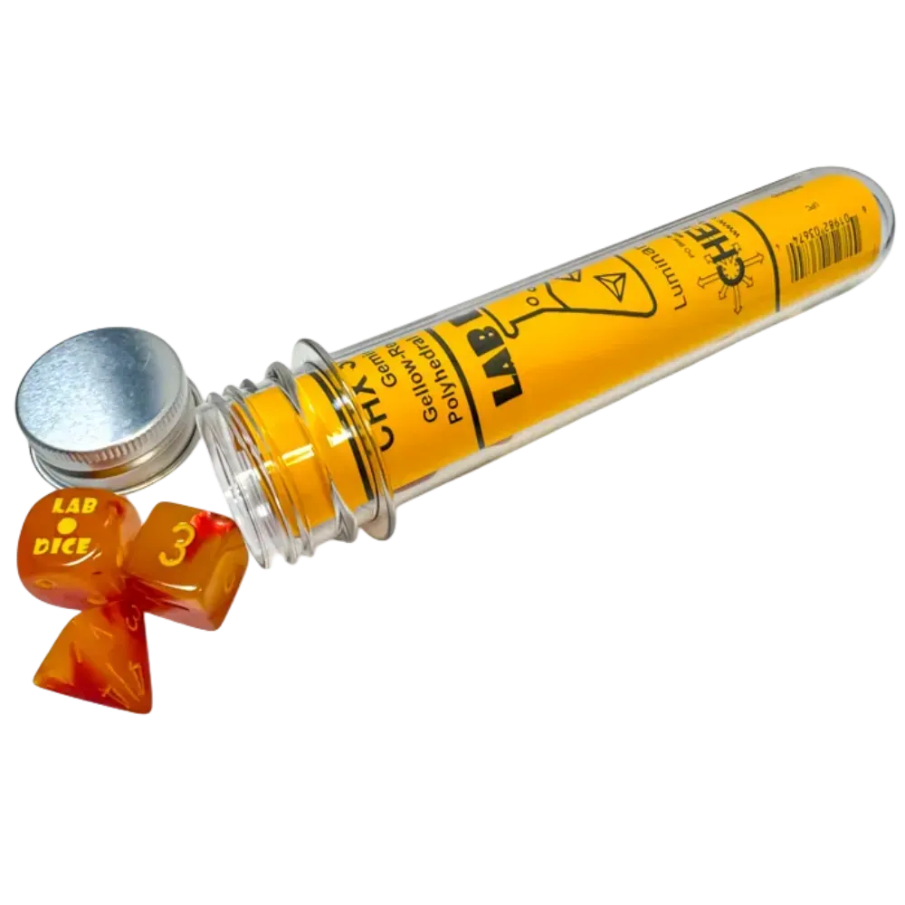 The dice are red and yellow with yellow numbers. They are packaged in a clear hard plastic container in the shape of a lab test tube.