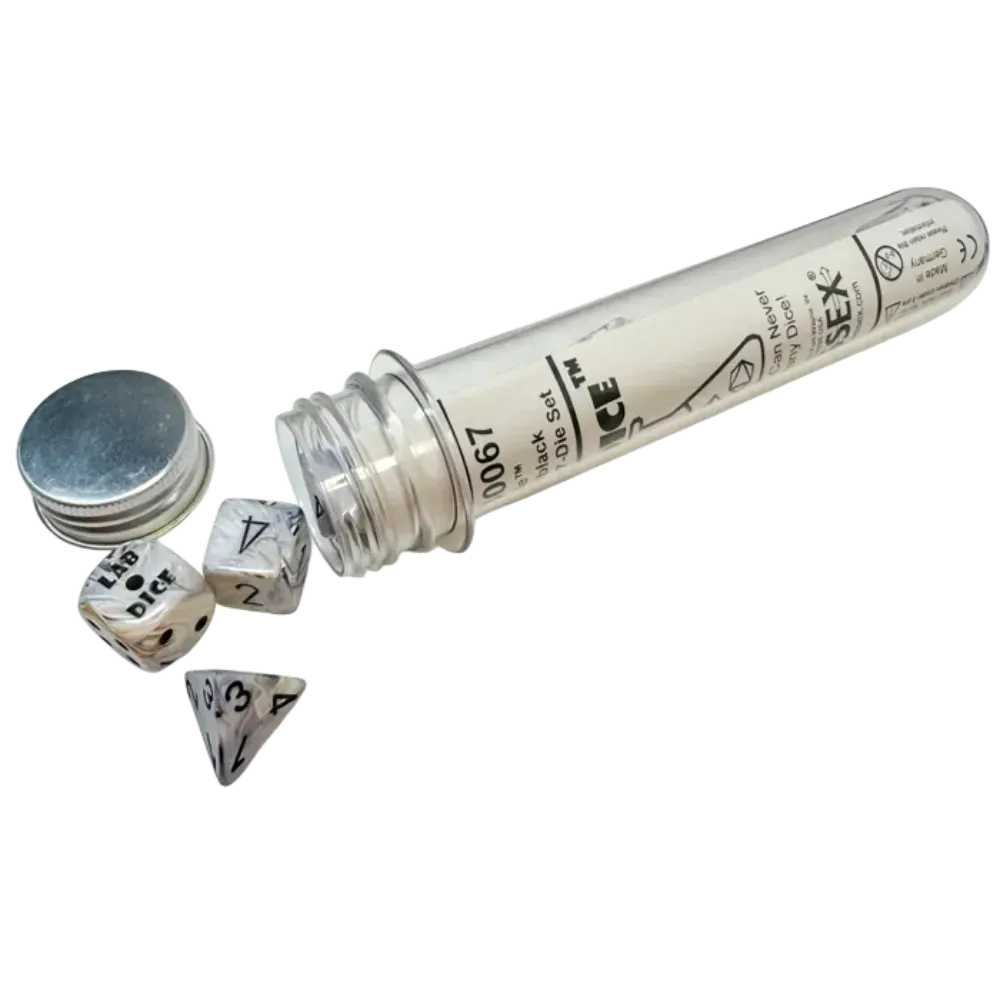 The dice are Calcite (white, black, gold, grey) with black numbers. They are packaged in a clear hard plastic container in the shape of a lab test tube.