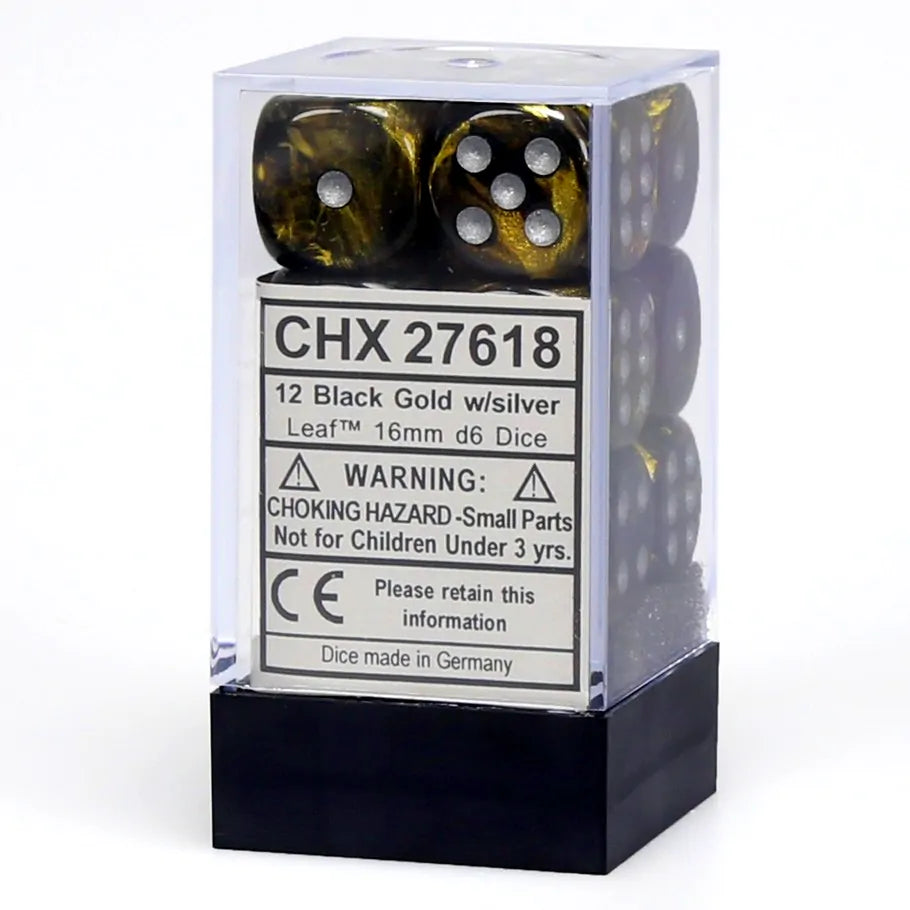 Chessex Leaf Black Gold with Silver Pips 16mm Dice Block (12 dice)