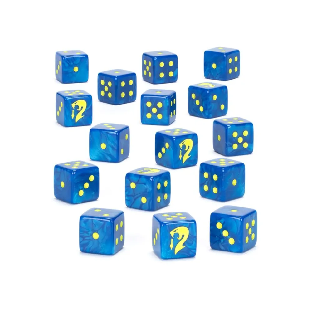16x Dice cast in pearlized blue acrylic plastic with yellow ink markings, and measure 16mm along each edge. The '6' face is decorated with the Kabal of the Poisoned Tongue icon.