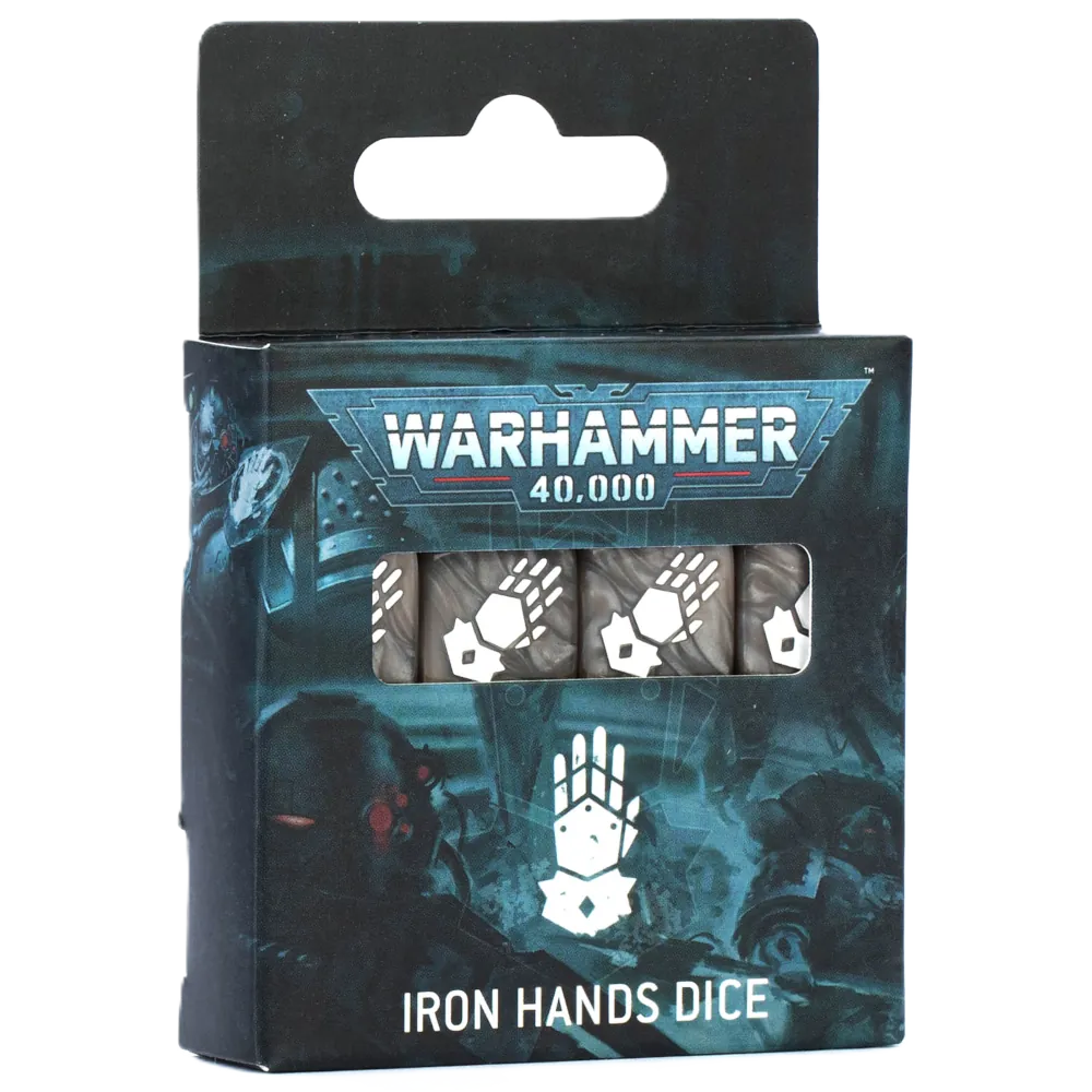 - 16x D6 dice cast in metallic grey swirl plastic with white ink markings, for use in games of Warhammer 40,000, themed around the Iron Hands
