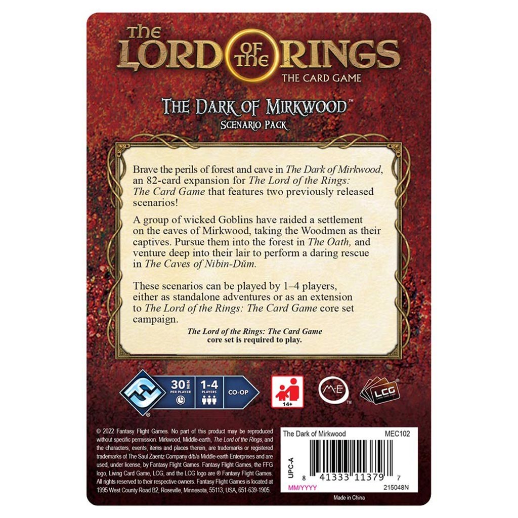 Brave the perils of forest and cave in The Dark of Mirkwood, an 82-card expansion for The Lord of the Rings: The Card Game that features two scenarios! A group of wicked Goblins have raided a settlement on the eaves of Mirkwood, taking the woodmen as their captives. Pursue them into the forest in The Oath, and venture deep into their lair to perform a daring rescue in The Caves of Nibin-Dǔm. These scenarios can be played by 1–4 players, either as standalone adventures or as an extension to The Lord of the Rings: The Card Game revised core set campaign. The core set is required to play.