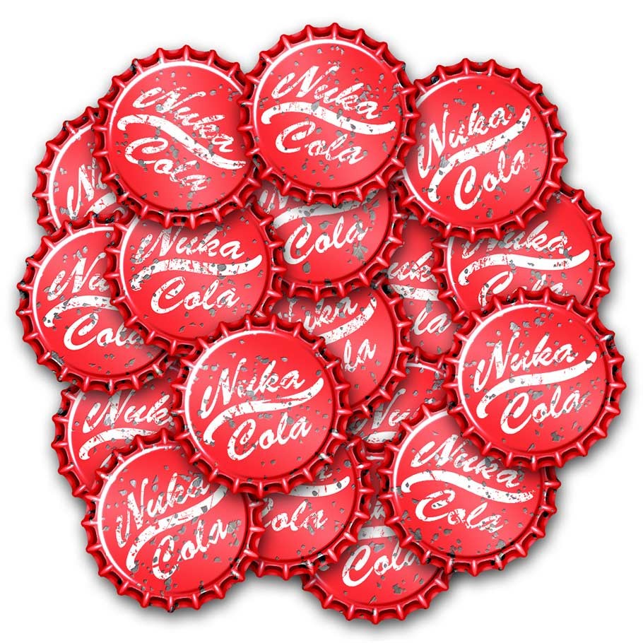 This is a set of 50 distressed Nuka-Cola bottle caps made by an official bottle cap manufacturer with an approved graphic design to resemble authentic Nuka-Cola caps!