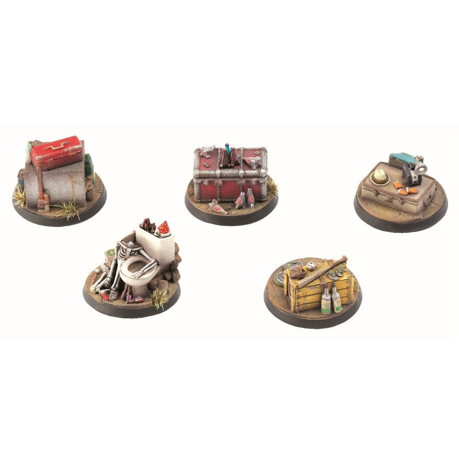 This boxed set contains five 32mm scale multi-part high quality resin objective markers, each part of unique scenic bases, to allow players to expand their Fallout: Wasteland Warfare games.