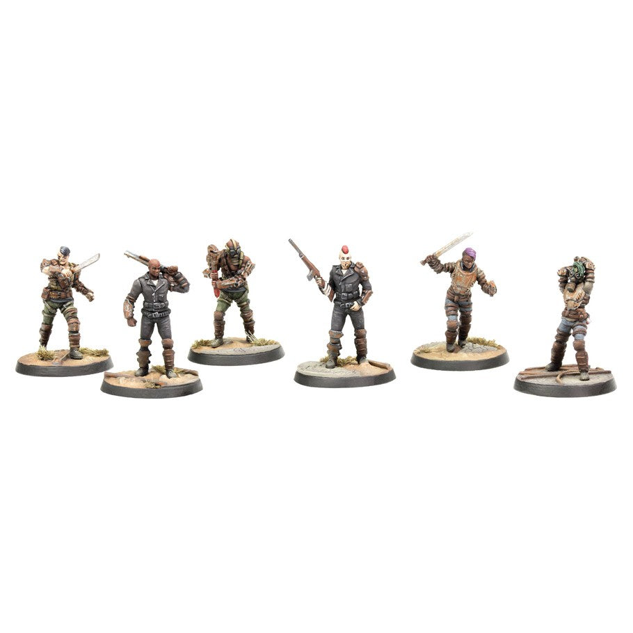 This boxed set contains six 32mm scale multi-part high quality resin Raider miniatures, each with unique scenic bases, to allow players to expand their Fallout Wasteland Warfare games.