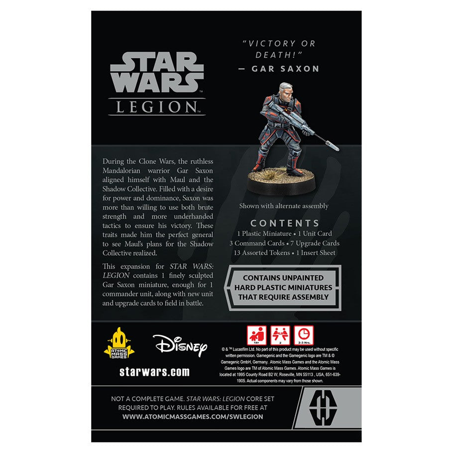 The ruthless Mandalorian warrior Gar Saxon blasts his way into Star Wars: Legion as a commander in Maul’s Shadow Collective! Filled with a desire for power and dominance, Saxon gives players even more options for their Shadow Collective forces with his elite Mandalorian training. What’s more, three command cards represent the brute strength and underhanded tactics he’s willing to use to ensure victory. Finally, seven upgrade cards give players the chance to equip Saxon with an array of deadly weaponry, including his iconic Galar-90 rifle, jetpack rockets, and a ZX flame projector.