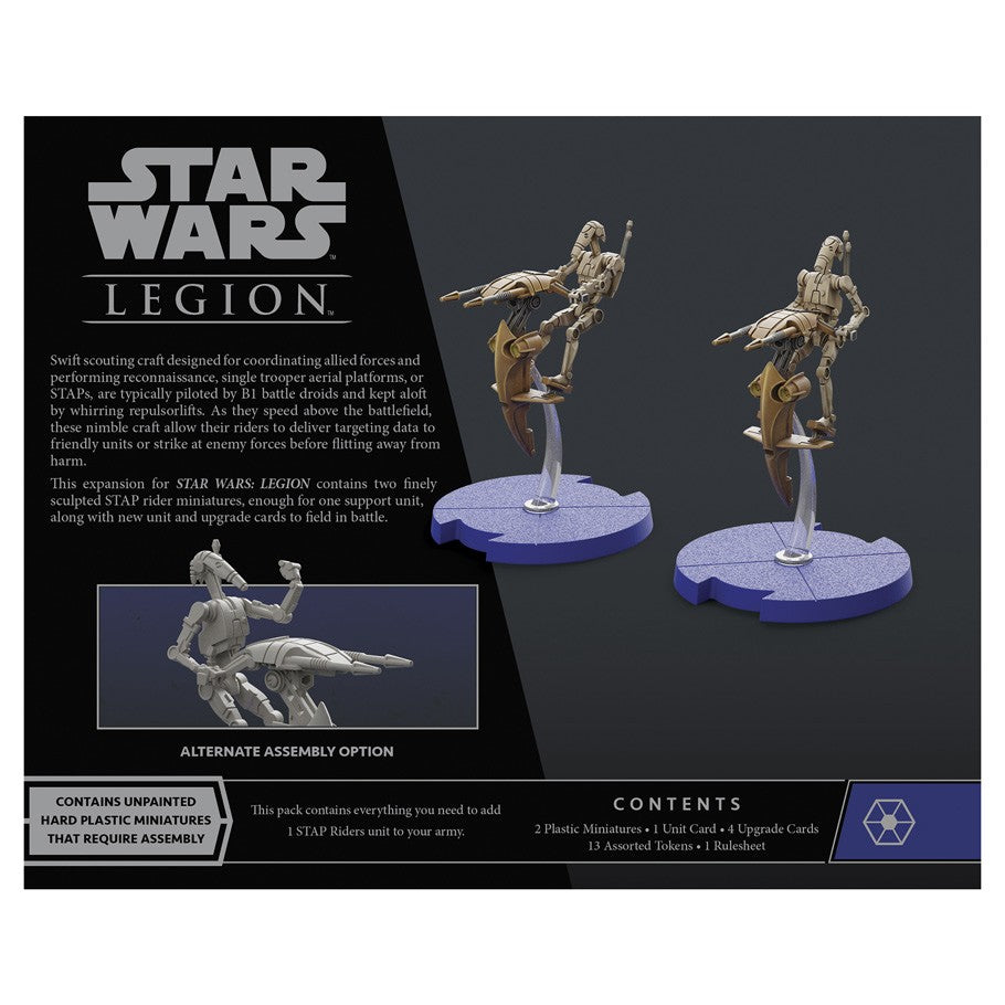Within the STAP Riders Unit Expansion, you’ll find two beautifully detailed, unpainted STAP rider miniatures that featuring a number of customization options. Two different flight stands let you depict them at different heights, while the STAP pilots themselves can be assembled in a variety of poses. Finally, four upgrade cards invite you to equip them with comms systems to more fully integrate your STAP riders into your army.