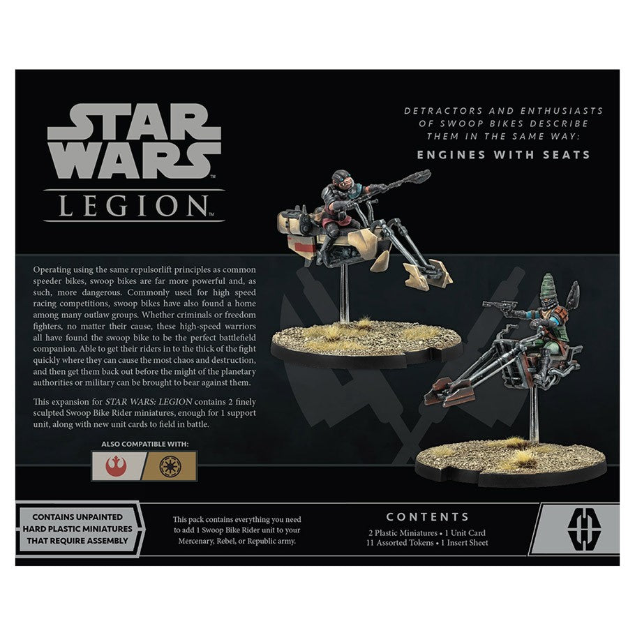 Whether criminals or freedom fighters, many groups across the galaxy see swoop bikes as the perfect battlefield companions that make their forces even more mobile. The support unit of two Swoop Bike Riders found in this expansion helps players get their forces into the thick of the fight quickly where they can cause the most chaos and destruction before zooming out before the might of planetary authorities can be brought against them. Able to be fielded by either the Rebel Alliance or gangs of mercenaries, these riders add a fast and furious new element to any army.