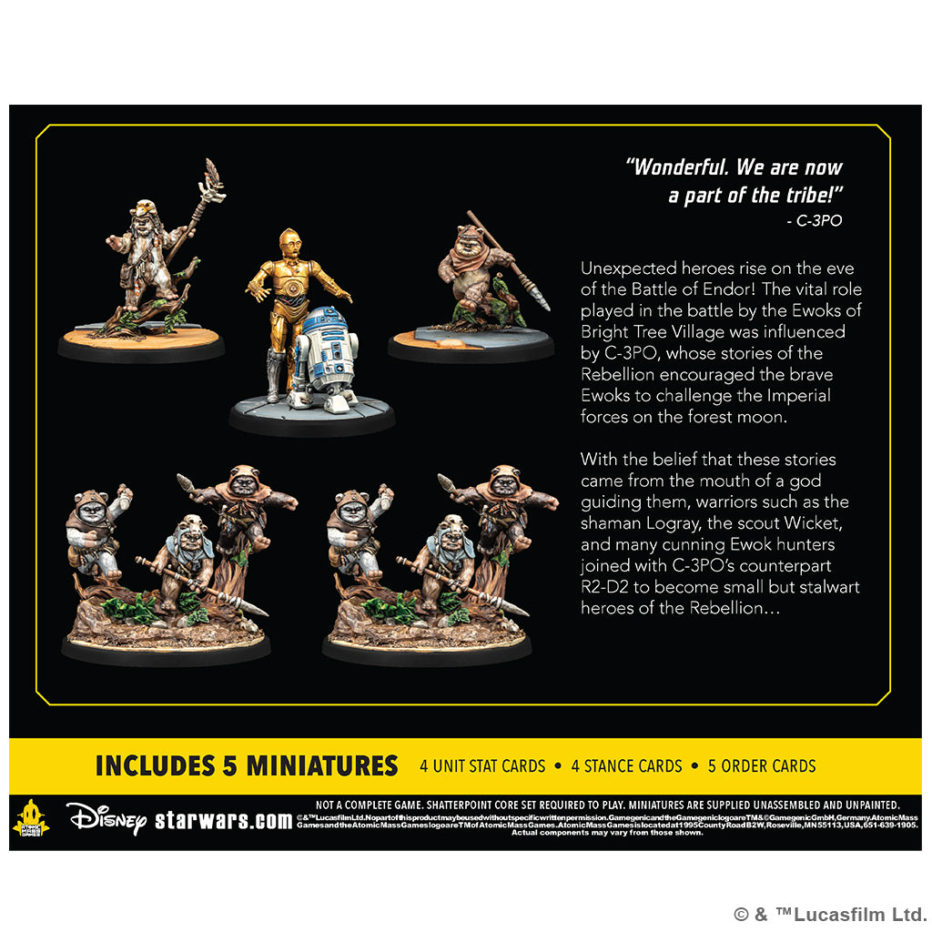 Unexpected heroes rise to join the battles of Star Wars™: Shatterpoint in this new pack! The Ewoks of Bright Tree Village played a vital role in the Rebellion's victory in the battle of Endor and this pack brings the Ewok shaman Logray into the game as a Primary Unit. He is joined by Wicket as a Secondary Unit and two Ewok Trappers wielding spears as a Supporting Unit. Rounding out the pack are R2-D2 and C-3PO, who join together to form another Secondary Unit option. In addition to miniatures of these characters, this pack also includes all the Stat, Order, and Stance cards players need to add these characters to their squads.