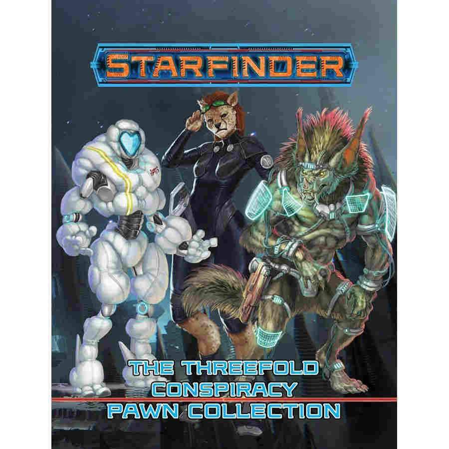 Key aliens and NPCs from The Threefold Conspiracy Adventure Path come alive on your tabletop with The Threefold Conspiracy Pawn Collection, featuring more than 100 creature pawns for use with the Starfinder Roleplaying Game or any tabletop science-fantasy RPG! Printed on sturdy cardstock, each pawn presents a beautiful full-color image of an alien, NPC, or starship from The Threefold Conspiracy campaign, including agents of the mysterious Unseen, strange shapeshifters, uneasy allies, and dozens of unique creatures.