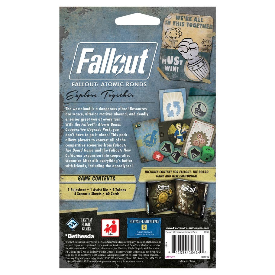 With the Atomic Bonds Cooperative Upgrade Pack for Fallout: The Board Game, the number of scenarios available to you just doubled. This upgrade pack has everything you need to play every competitive scenario from Fallout: The Board Game and the New California expansion as a cooperative scenario. Rather than struggling against each other, Atomic Bonds lets you and your friends travel the Wasteland, grab the best gear, and push your chosen faction to victory—together! Combine that with the addition of modifications, mutations, and workshop upgrades, and Atomic Bonds pushes your games of Fallout to dizzy new heights.