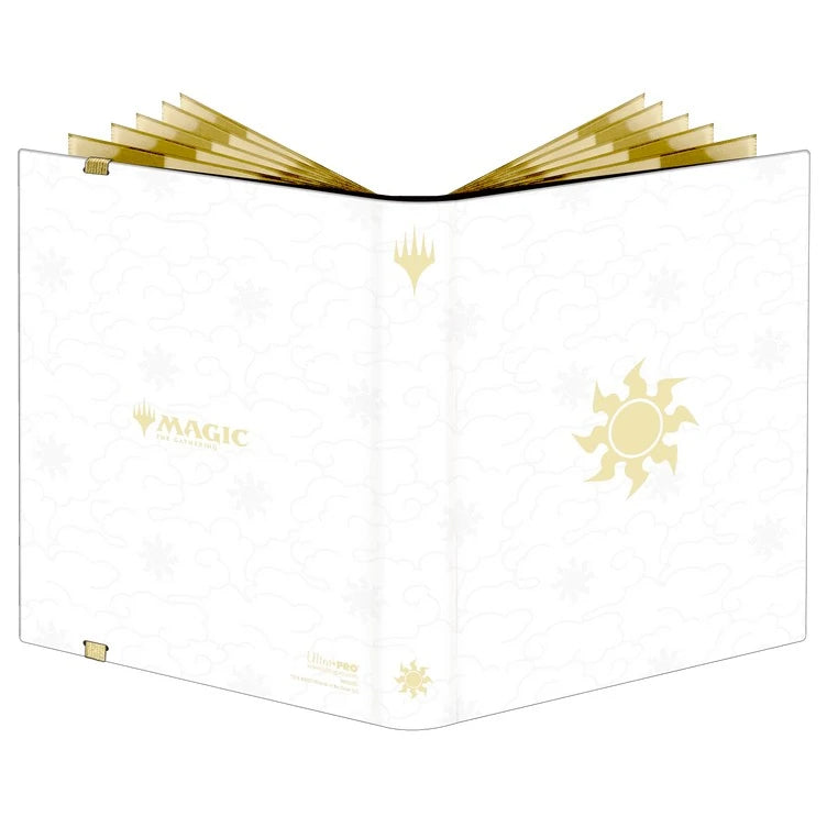 This 9-Pocket PRO-Binder for Magic: The Gathering features a white leatherette material with the iconic gold Plains symbol and matching gold elastic strap. Store and protect up to 360 standard size trading cards double-sleeved in Ultra PRO Deck Protector® sleeves. Each pocket page is backed with a low-friction, gold material to give cards a classic, framed look. Side-loading pockets and low-friction material help keep cards in place. All materials are archival-safe, acid-free, and non-PVC for premium protection.
