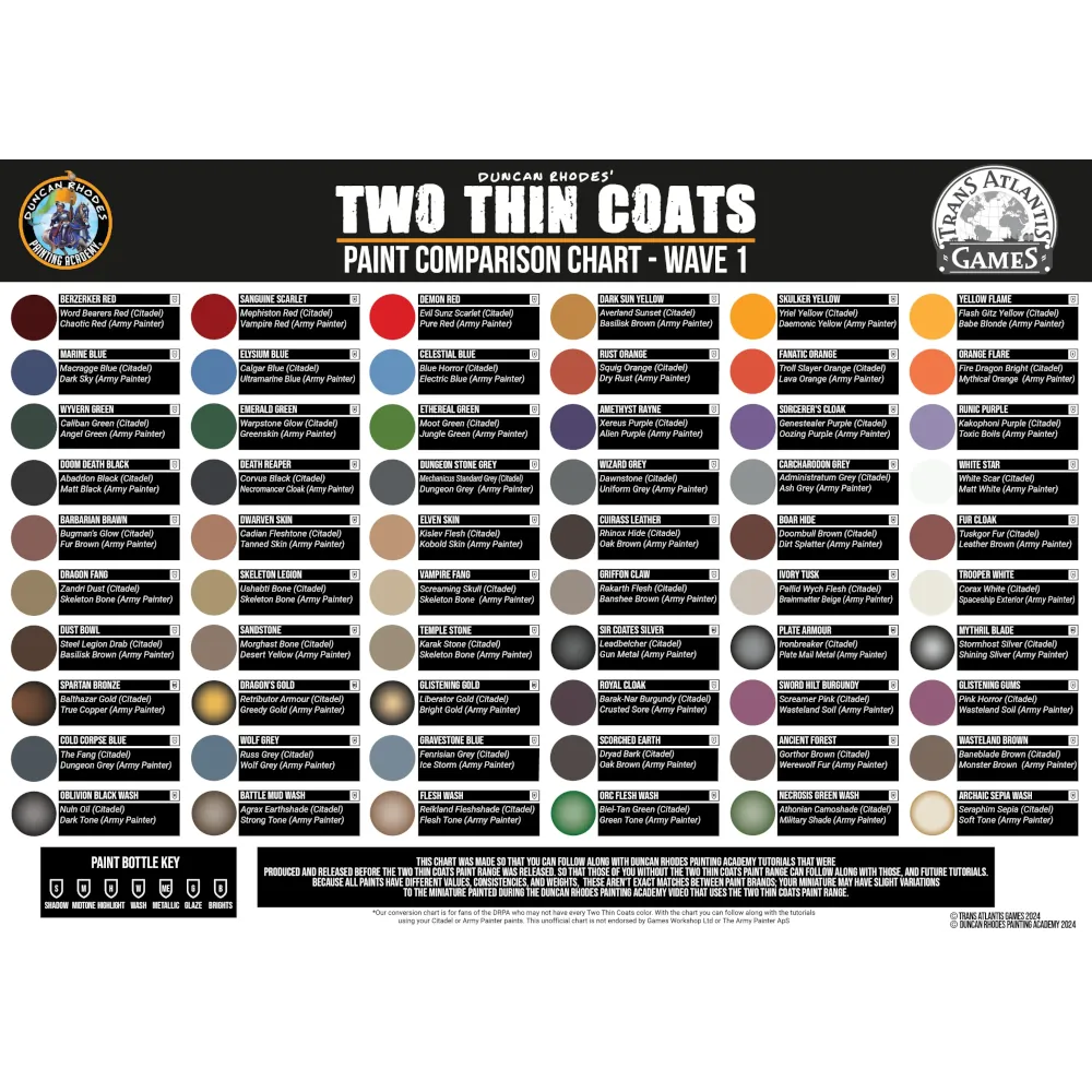 Two Thin Coats Paint is an acrylic paint based on their unique and proprietary medium. This medium was hand crafted over many iterations by Duncan Rhodes (of Games Workshop and Duncan Rhodes Painting Academy fame!) to provide the absolute best in coverage, flow, and ease of use. These paints have a slightly satin to matte sheen when dry, and dry to a super smooth finish when applied in two thin coats.